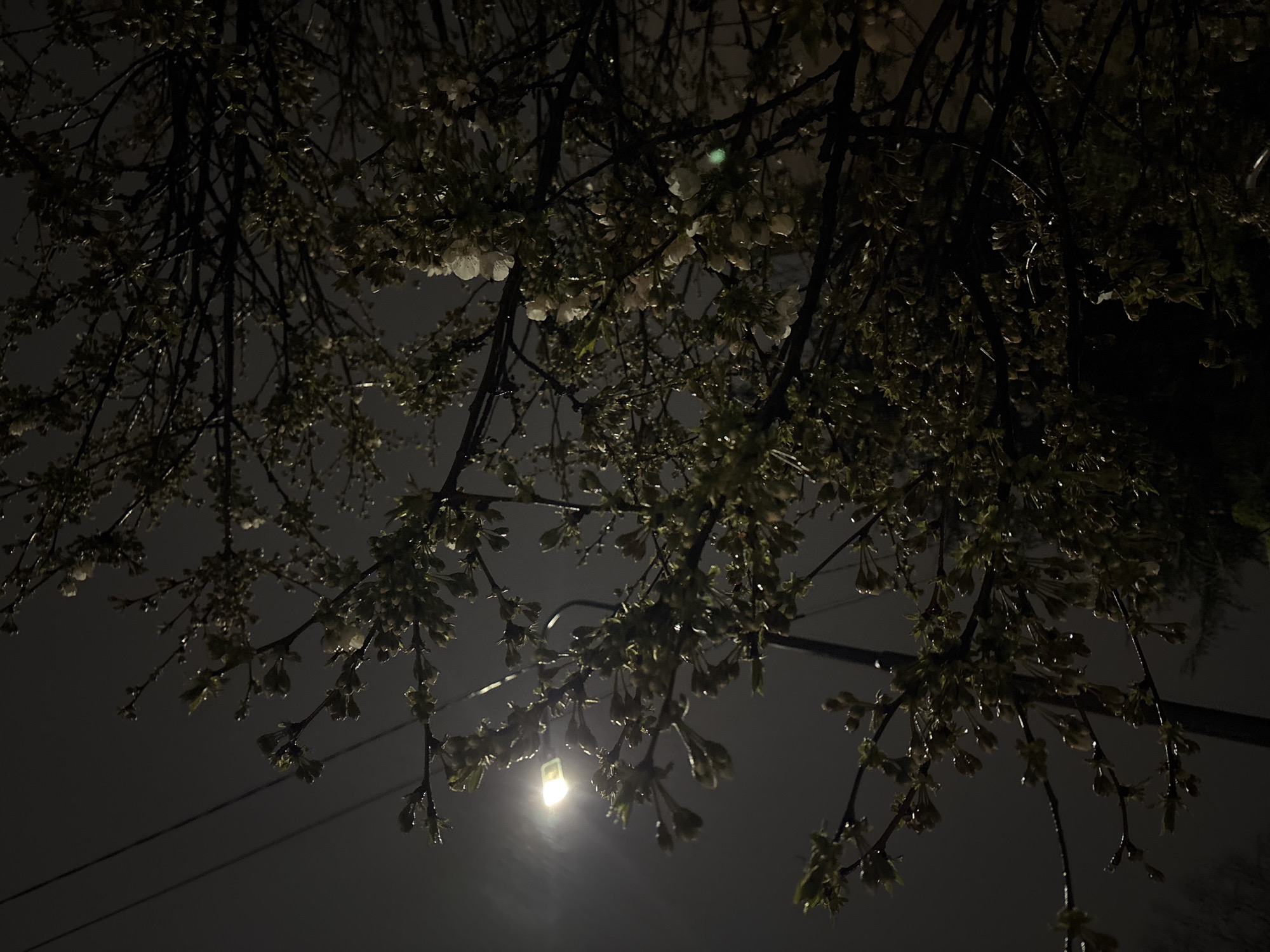 night scene in an urban setting. A tree with branches extending across the upper half of the frame is in the foreground. Some of the branches have blossoms or buds. A street lamp illuminates the scene from below, creating a strong light source near the center of the lower half of the image. Power lines are visible passing through the branches. The location is Kragujevac, Serbia, as specified in the instructions. No people are visible in the scene. The overall environment is dark.