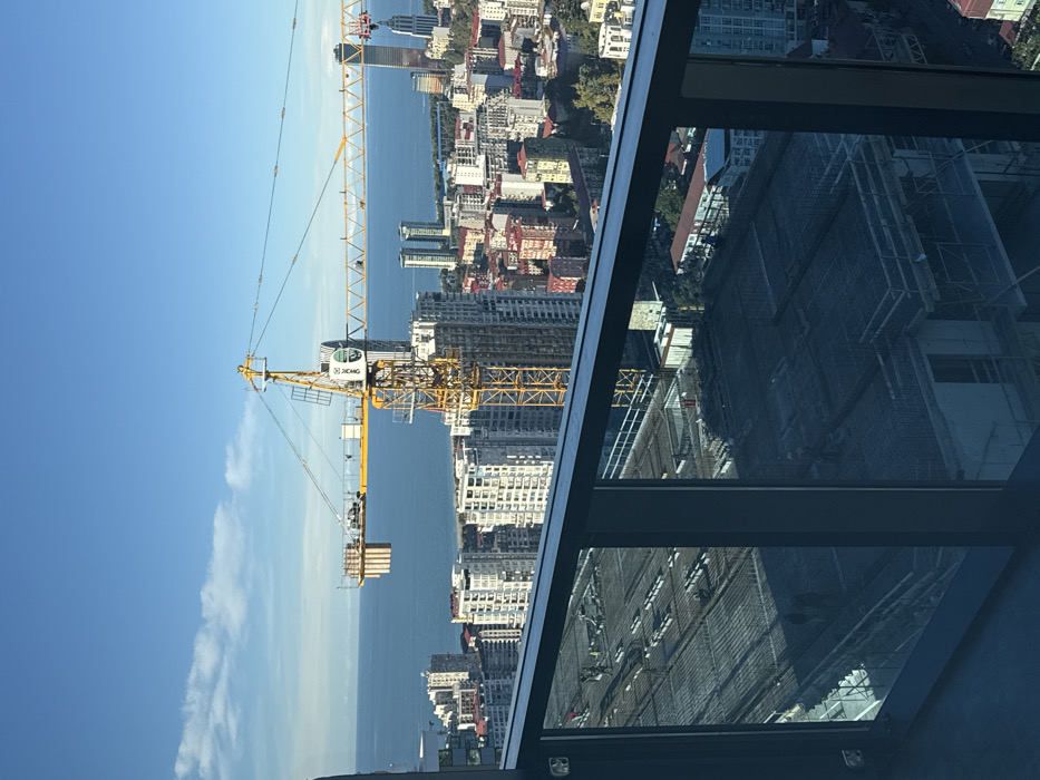 An elevated panoramic view of the city of Batumi, Georgia, overlooks the Black Sea under a clear blue sky. The immediate foreground is framed by a dark-colored glass balcony railing. Directly beneath the viewpoint, a multi-story building is under active construction; its uppermost visible level is a reinforced concrete slab, where approximately four to six construction workers are discernible, engaged in construction tasks. In the midground, a prominent yellow XCMG tower crane is positioned over the urban landscape. The crane's boom extends horizontally, actively hoisting a load of palletized materials towards the left. The city of Batumi stretches to the horizon, presenting a dense arrangement of various buildings, including a mix of modern high-rises and older residential structures. Notable landmarks include a pair of slender, dark-colored twin towers and a distinctive reddish-brown skyscraper (Batumi Tower/Alphabetic Tower) in the distance to the right. The Black Sea forms the distant horizon, with a visible strip of coastline. The sky above is clear blue with sparse white clouds.