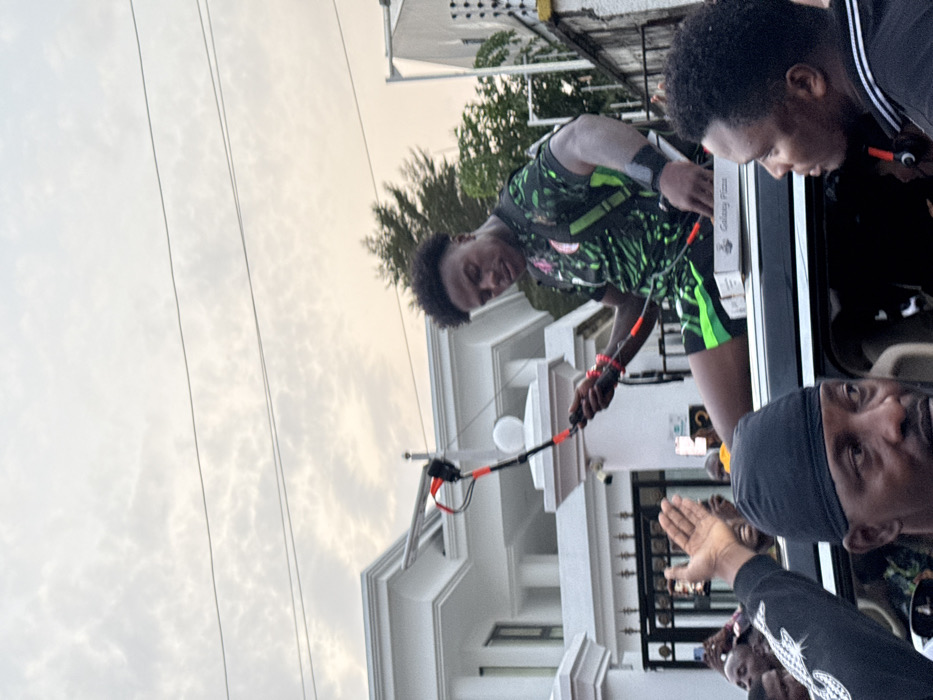 A man in a green and black patterned shirt and shorts uses a black selfie stick, facing downward with a serious expression. Another man peers out of a car window next to him. A third man, wearing a black durag, raises his hand in the foreground. A white building with ornate details serves as a backdrop. A pizza box is visible in the car. Overhead, the sky is overcast with a mix of white and grey clouds, with electrical wires present.