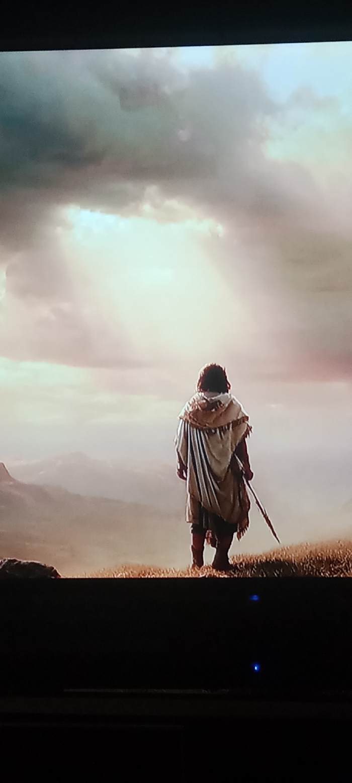 This image is a photograph of a screen displaying a scene. The photograph was captured in the city of Abuja, Nigeria. The lower approximately 20-25% of the frame is a dark, out-of-focus area, indicating the edge of a screen or an object in the immediate foreground of the camera's perspective. Two small, circular blue indicator lights are visible within this dark area. The displayed scene features a lone individual, positioned centrally and viewed from behind, facing away from the viewer towards a distant landscape. The person has dark, shoulder-length hair. They are dressed in layered garments: a light-colored, possibly off-white or light grey, poncho-style cloak or wrap with visible texture or fringing, worn over a darker inner layer that extends to their lower legs. They wear dark boots. A long, slender staff or spear-like object is held vertically in their right hand, with its tip resting on the ground. The individual stands on a gently sloping, dry, grassy hilltop or ridge. In the background, multiple layers of mountains or hills recede into a hazy distance, suggesting a vast, open environment. The sky above is dominated by dramatic, heavy clouds, ranging in color from dark grey to lighter grey, white, and subtle hints of pale pink or orange. Several distinct shafts of sunlight penetrate the clouds, illuminating the sky and portions of the distant terrain. No other individuals or subjects are visible, and no direct interactions are depicted; the person appears to be observing the expansive vista.