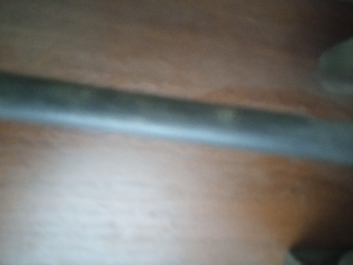 close-up of a dark grey pipe, running horizontally across the frame. The pipe is slightly out of focus, and the background is a blurry brown surface. It is impossible to determine the location or any actions occurring.