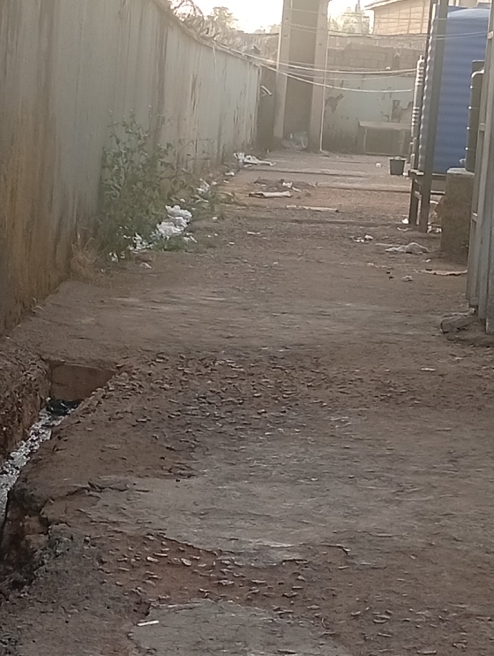 A narrow, neglected alleyway is depicted with high walls flanking either side. The ground is uneven and covered in dirt and debris. A deep trench runs along the left side, partially filled with water or dark fluid. Litter is scattered along the base of the wall on the left. In the distance, there is a glimpse of buildings and utility poles. A few large, blue water tanks are visible on the right. The lighting suggests it is either early morning or late afternoon.