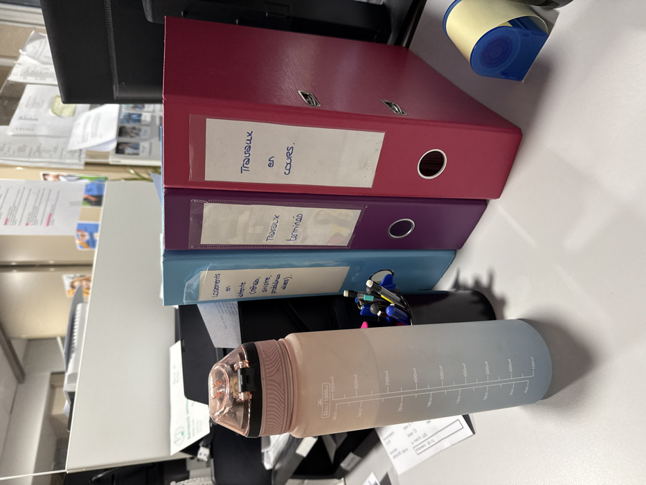 This image depicts a segment of an office workspace located in Saint-Étienne, France. The scene is presented from a slightly elevated perspective, focusing on objects arranged on a light gray desk surface. In the foreground, a two-tone translucent water bottle, displaying a gradient from pink at the top to light blue at the base, is positioned slightly left of center. The bottle is calibrated with volume markings up to 1000ml (32oz) and contains approximately 500-600ml of clear liquid. Its lid is rose gold/pink, featuring a black sipper and a carrying loop. To the right of the bottle, a black cylindrical container holds an assortment of writing instruments, including multiple pens with blue, black, and metallic bodies. Further right, three vertical ring binders are arranged in a row: a light blue binder, a purple binder, and a magenta-pink binder. The light blue binder features a handwritten label in a clear plastic sleeve, reading "LOGEMENTS en attente (réhab, sinistre, problèmes divers)." The purple binder has a similar label stating "Travaux terminés," and the magenta-pink binder is labeled "Travaux en cours." On the far right, partially visible, is a roll of beige adhesive tape housed in a blue dispenser. The background reveals a typical office setting. Elements include a prominent white partition or desk divider, a dark office tray containing papers behind the bottle and pen holder, and a partially visible black computer monitor behind the rightmost binder. Other documents and papers are visible on background surfaces, some affixed to a wall or partition. No individuals are present in the image.