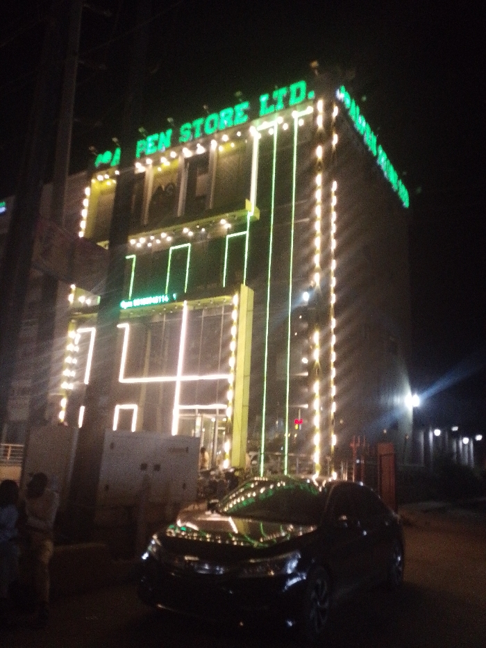 A building with "A.A. Pen Store LTD" in green neon lettering on the top floor is brightly lit with vertical lines of green lights and rows of white lights outlining the edges. A black car sits parked in front. People are visible in front of the building near a white trailer or utility box. Streetlights are visible in the background. The image is taken at night.