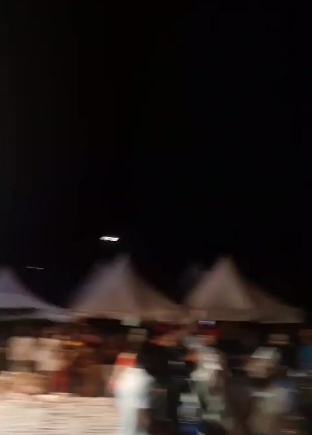 stage with a pink neon sign that reads "Ferrado" at an outdoor event. There is a large LED screen displaying images to the right of the stage. A group of people are on the stage and some are standing in front of it. The camera moves to show a large crowd of people in the foreground and several tents in the background. The environment is dark, suggesting it's night.
