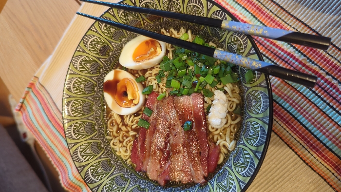 The scene depicts a prepared bowl of ramen, presented in an overhead view