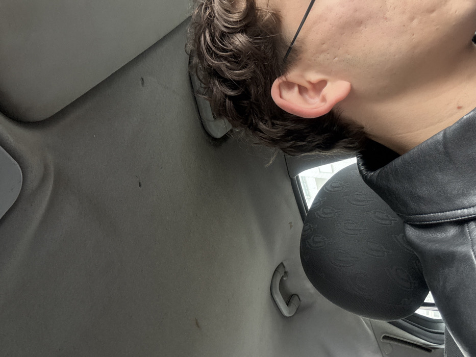 The image displays the interior of a vehicle. A person is seated, partially visible on the right side of the frame, facing left. The individual has curly dark brown hair, a visible right ear, and the right side of their face, exhibiting some skin texture. They are wearing dark-framed glasses and a black leather jacket. A black fabric car seat headrest, featuring an embossed circular pattern, is positioned in the lower-left to mid-left section, partially obscured by the person. The vehicle's overhead lining is gray, showing minor stains and inconsistencies, with a gray grab handle mounted on the left side. Through a window, likely a side window, a blurred outdoor environment is visible, featuring a light-colored building structure. The specific location within the city of Bragança, Portugal, cannot be determined from the visual information provided.