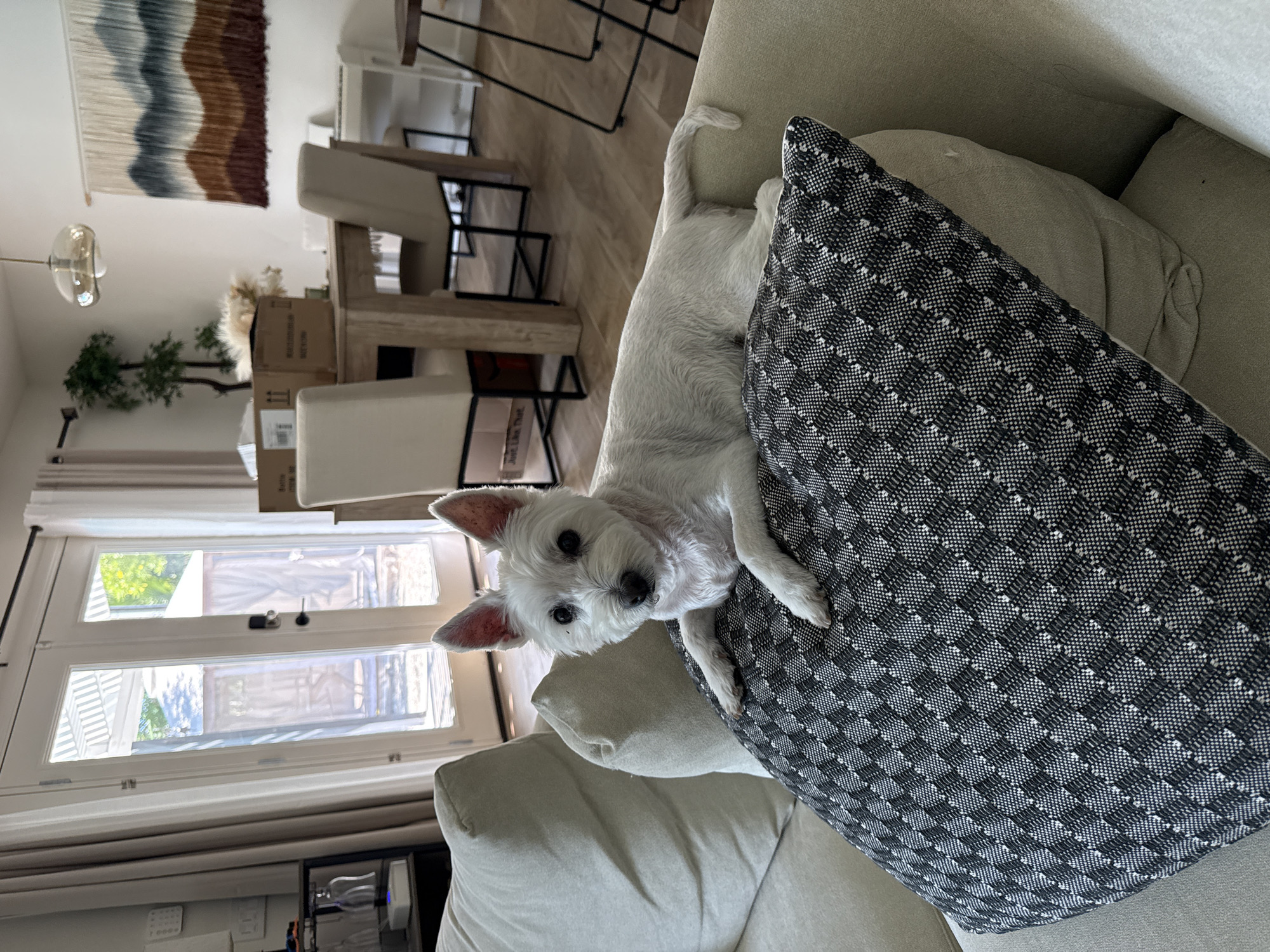 - "A white dog is resting on a couch with a black and white checkered pillow" by FM-YBthC3, licensed under CC BY 4.0