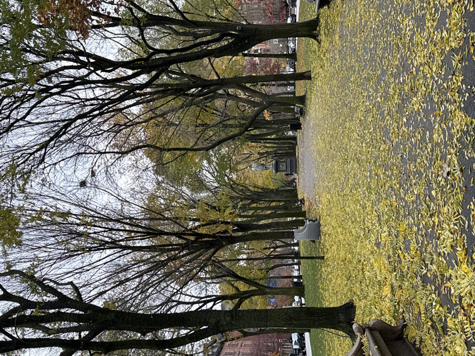 A tree-lined path stretches into the distance, covered in yellow leaves. Trees with bare branches reach overhead, forming a canopy above the path. Benches line the walkway, and a statue is visible in the distance. Buildings and parked cars are seen on either side of the path, with some remaining green grass also visible.