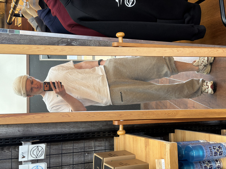 A mirror reflection shows a person wearing a white t-shirt, grey sweatpants, a light-colored beanie, and sneakers