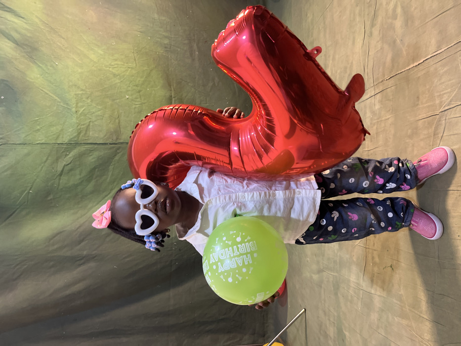 The image depicts a young Black child standing centrally within what appears to be an indoor photography studio in Jos, Nigeria. The child, likely female, faces forward, wearing white heart-shaped sunglasses, a light-colored button-up collared shirt, dark blue trousers patterned with various light-colored shapes, and pink sparkly sneakers with white soles. Her dark hair is styled in multiple small braids or twists, adorned with a pink bow hair clip positioned on the top of her head and light blue beads near some braid ends. In the child's left hand, she holds a round, lime-green latex balloon with "HAPPY BIRTHDAY" text printed in white. In her right hand, she holds a large, red, reflective foil balloon shaped like the numeral "2." The child stands still, posing for the camera. The background consists of a dark olive-green fabric backdrop, showing visible creases and folds. The floor is covered with a matching dark olive-green fabric, also exhibiting folds. A metallic leg of a tripod or stand is partially visible on the floor to the left of the child.