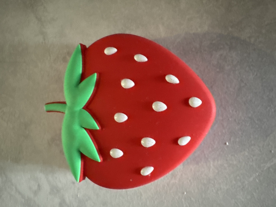 A stylized, strawberry-shaped object is centrally positioned against a uniform, light grey background within the city of Le Puy-en-Velay, France. The object features a prominent red body, roughly heart-shaped, topped with a cluster of five vibrant green leaves and a short green stem. Approximately 20-25 small, raised, oval-shaped white dots are systematically distributed across the red surface, simulating strawberry seeds. The object appears to be a decorative item, possibly made of plastic or silicone, exhibiting a smooth texture with a slight sheen. Illumination originates from an unseen source, casting a subtle shadow of the strawberry onto the background, predominantly towards the lower right. The background itself presents a slightly textured, monochromatic grey surface, devoid of any additional identifiable features, subjects, or actions.