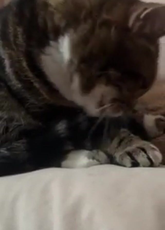 - "A brown tabby cat with white markings licks its paw while lying on a white surface that appears to be a pillow" by FM-aeu8u2, licensed under CC BY 4.0