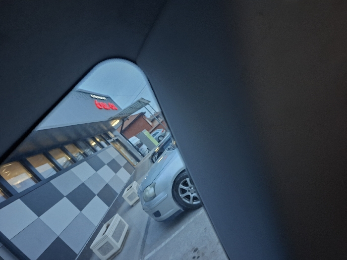 - "The image displays a rotated reflection, consistent with a view captured from a vehicle's rearview mirror, with the immediate foreground obscured by a dark, non-reflective surface" by FM-8S2Zq2, licensed under CC BY 4.0