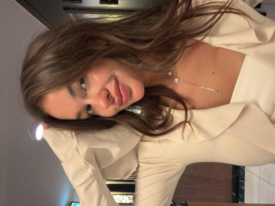 A young woman with shoulder-length brown hair tilts her head, facing the camera with a slight smile
