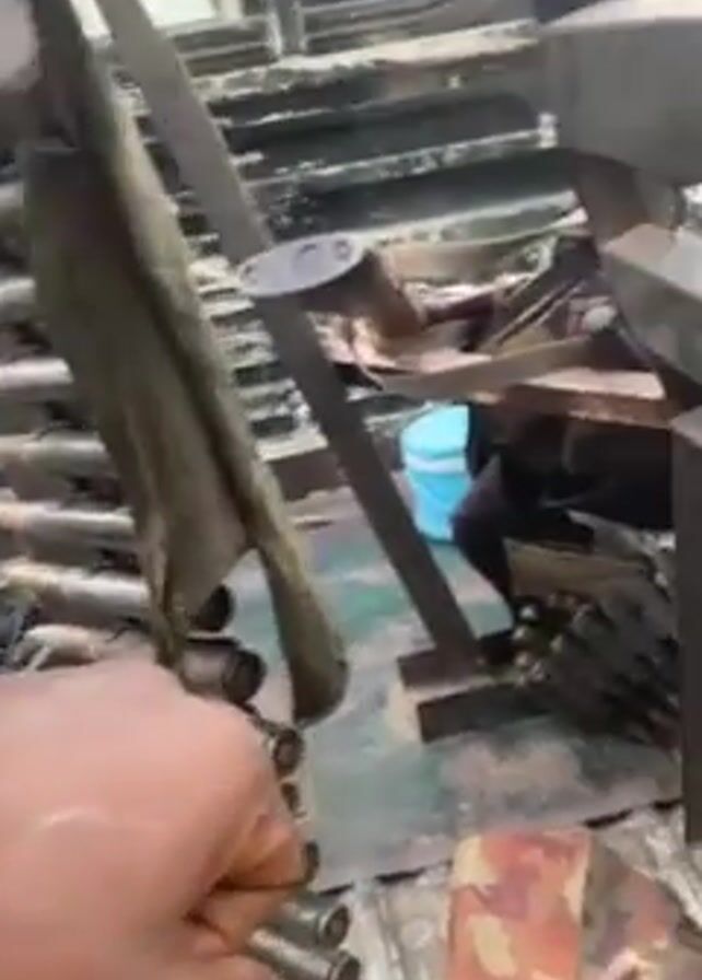 The interior of a vehicle is shown, possibly a military vehicle. Ammunition rounds are visible in a belt, likely for a machine gun. Metal frames are constructed within the vehicle, with what appears to be a seat and various tools. A person is partially visible inside the vehicle, dressed in dark clothing, next to a blue bucket. The vehicle's interior is cluttered with various items.