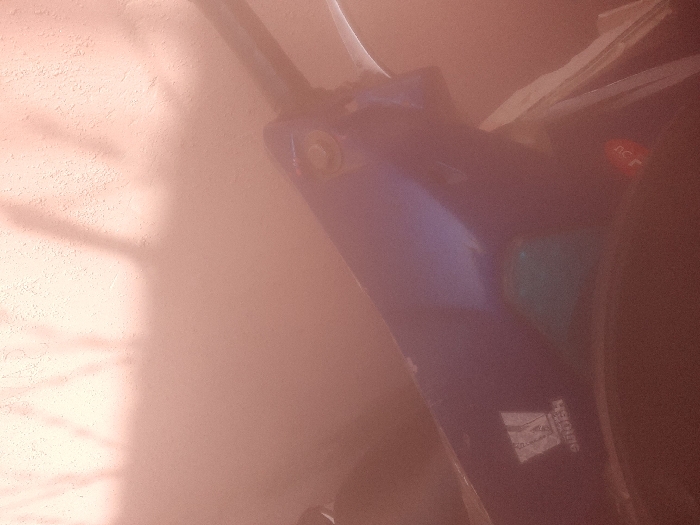 The image, reportedly from the city of Gayawa, Nigeria, displays a partial view of a blue object, likely a component of a vehicle. This object features a reflected white logo, partially legible as "WES[TEL/TERN]", and a circular metallic fastener on its upper right section. A small red rectangular sticker with inverted white lettering, possibly "ncr", is affixed to a dark surface immediately beneath the blue object. The background consists of a textured, light reddish-brown wall with multiple distinct, elongated shadows cast upon its surface. No individuals or explicit actions are present. The scene is characterized by a pervasive reddish-brown color cast.