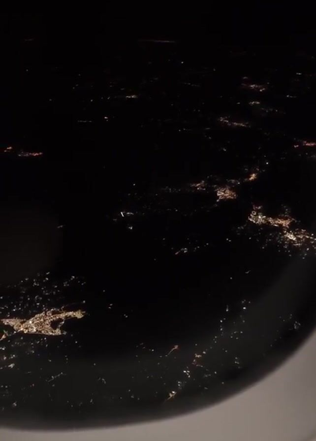 From an airplane window, a night view shows a city's lights scattered across the dark landscape below. The edges of the window frame are visible in the foreground.