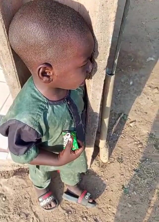 A young child is seen crying beside a concrete pillar. The child has dark skin, very short hair, and is wearing a green outfit with black details, along with Adidas-branded sandals. The child is holding a small, wrapped object in their hand. They are standing on sandy ground. The pillar casts a shadow over the child. A piece of metal pipe is resting against the pillar. Someone can be heard asking the child why they are crying.