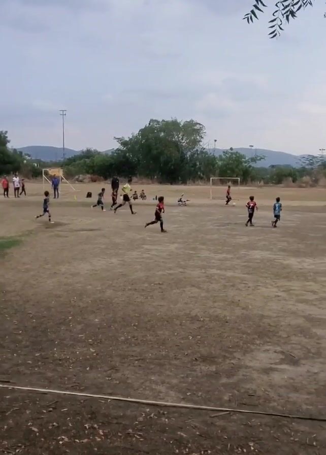 group of children playing soccer on a dirt field