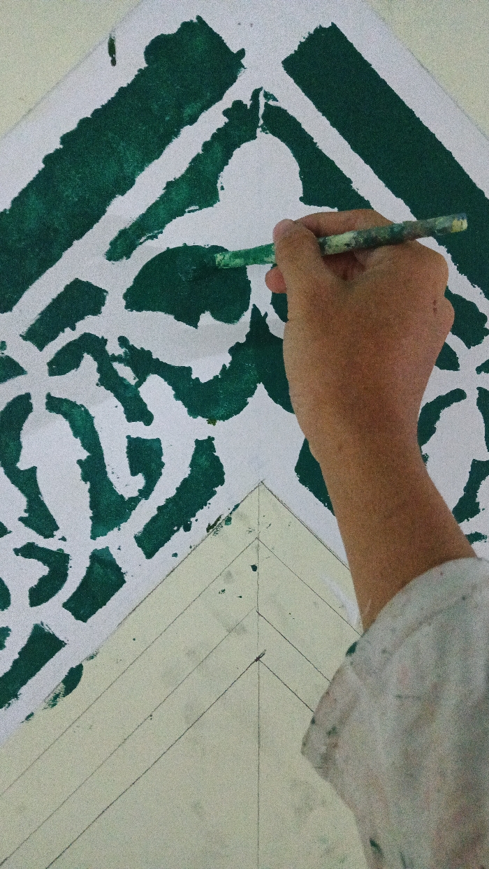 In Cutneuheun, Indonesia, an overhead shot captures a human hand actively engaged in painting. The hand, with light to medium skin tone, is positioned in the upper right quadrant of the frame, holding a paint-covered brush with green bristles and a yellow handle. The brush is being applied to a white surface, which displays an intricate, partially completed green and white pattern, possibly a stencil or freehand design. The pattern features bold, organic, and geometric shapes, with areas already filled in dark green paint, exhibiting a textured appearance. Below the painted area, faint pencil lines are visible on a light-colored surface, outlining future sections of the pattern, indicating a guided artistic process. A portion of a white, possibly paint-splattered, sleeve is visible on the lower right arm. The overall scene depicts a stage of creation or restoration of a decorative artwork.