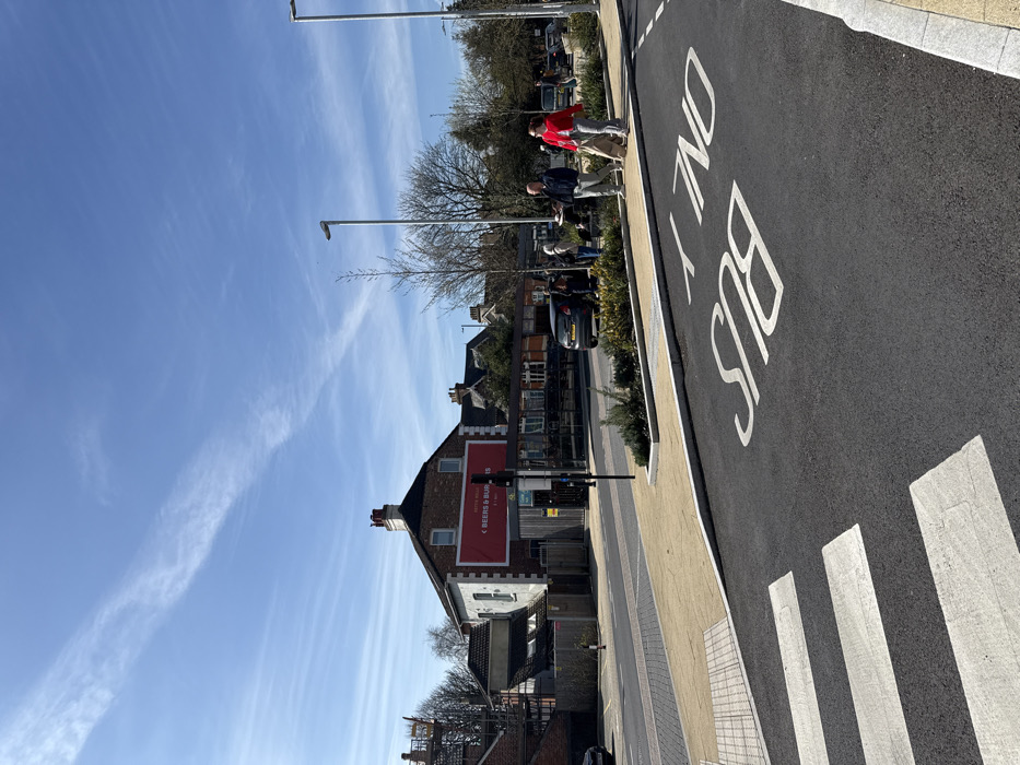 The image depicts a sunny street scene at the junction of Queen Street and Endless Street in Salisbury, United Kingdom. The sky is clear blue with faint, wispy cirrus clouds. In the immediate foreground, a newly paved asphalt road features a white zebra crossing and the inverted white road marking "BUS ONLY". Adjacent to this, a light-colored block paving forms pedestrian pathways, bordered by a curb and raised planters containing small, sparsely leaved shrubs. The central building is a two-story brick structure, identified as "The Queen's Head" pub, featuring a large red banner sign on its upper facade that reads "QUEEN'S HEAD BEERS & BURGERS". To the left of the pub, scaffolding is erected against an adjacent building. Beyond the main road, additional buildings and bare deciduous trees are visible. Modern, dark grey streetlights are positioned along the pavement on the right. On the right-hand pavement, two pedestrians are walking away from the camera. The lead individual, a male, wears a dark blue long-sleeved top and light grey trousers, holding a white, circular container or tray in his right hand. Following him is a female, dressed in a red long-sleeved top and light grey trousers, carrying a light-colored bag or item in her right hand. Further in the mid-ground, several other individuals are standing near parked vehicles, which include a dark grey hatchback.