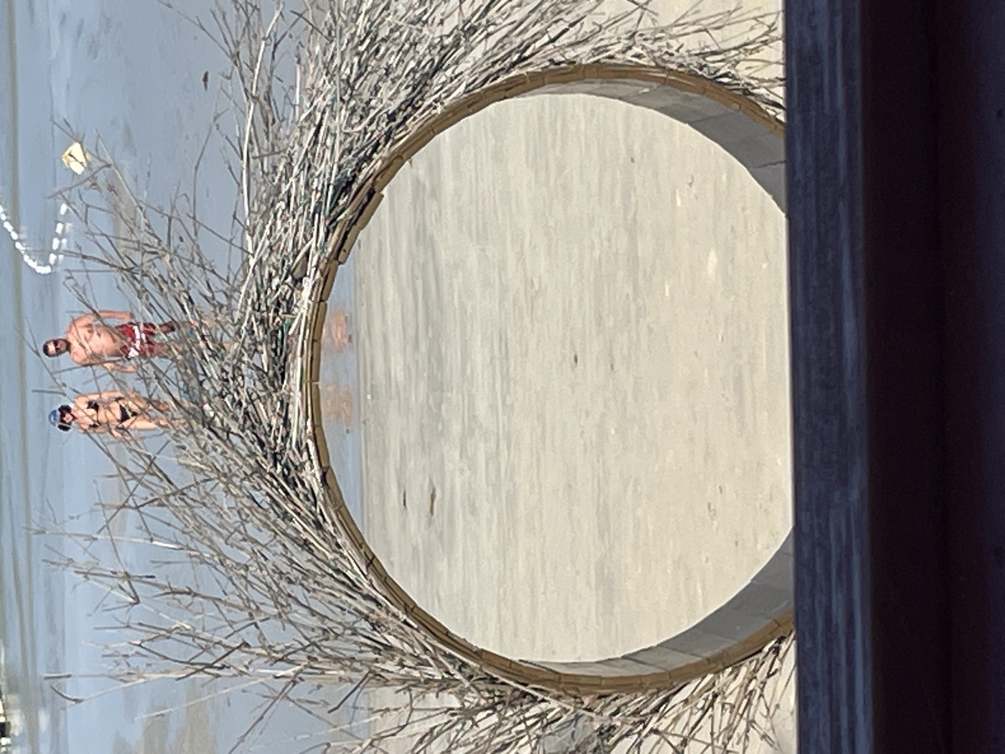 scene in Dong Ninh Hoa, Vietnam. Through a circular decorative window made of interwoven branches, two people are visible swimming in a body of water, likely the ocean. One person is wearing red swimming trunks, and the other is wearing a black swimsuit and a blue swimming cap. A small yellow object floats in the water nearby. To the right of the window, a dark vertical element obscures part of the view.