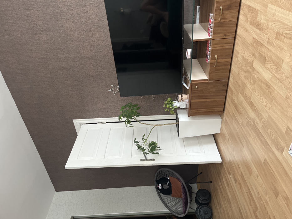 This image presents an interior view of a room, identified as being in Liepaja, Latvia. The floor consists of light-toned laminate wood planks. The dominant wall, positioned at the rear and extending to the right, is covered in a textured, dark brown wallpaper. A segment of a lighter, patterned wallpaper is visible on the far left wall. The ceiling is white. Centrally positioned, a white interior door, featuring five horizontal panels and a silver-colored handle, stands ajar, opening inward to the left. To the left of this door, a circular grey woven chair holds a brown cushion and a black neck pillow adorned with a white ninja motif. Two black dumbbells are placed on the floor directly in front of the chair. To the right of the open door, a tall, slender white planter contains a multi-stemmed green leafy plant. Adjacent to this is a modern media console crafted from light and dark wood, featuring a clear glass surface. Resting on this console is a large, black, flat-screen television. On the console's top surface, a white bust-shaped planter holding a small green plant, a pink cylindrical container, and a small white object are present. Within an open shelf below the glass top, two rows of small, circular, silver-lidded containers with red contents are neatly arranged. A white wire star ornament is affixed to the dark brown wallpaper above the right side of the television. No individuals or active interactions are depicted within the scene.