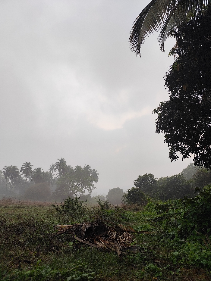 The image displays an outdoor, natural landscape located in Querim, India, under a uniformly overcast, light grey sky. The scene is enveloped in a significant atmospheric mist or fog, reducing visibility and imparting a muted, desaturated appearance to distant elements. In the immediate foreground, dark green, dense ground vegetation covers the lower portion of the frame. Centrally, a pile of dry organic debris, predominantly consisting of dark brown, dried palm fronds and other plant matter, rests on the ground. Towards the midground, a field of lighter green vegetation is partially obscured by the mist. Beyond this field, a line of trees, including multiple tall palm trees visible on the left and various broadleaf trees, emerges indistinctly from the fog. On the far right, a large, dark green tree with dense foliage occupies a significant portion of the frame, with a single palm frond extending from the upper right corner. No individuals, animals, or artificial structures are present or discernible within the depicted environment.