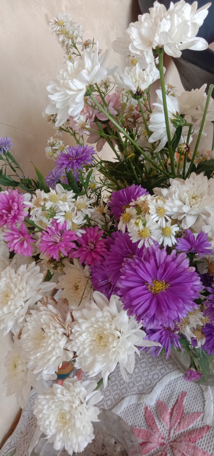- "A dense floral arrangement, predominantly composed of white chrysanthemums, various small white daisy-like flowers with yellow centers, and several purple and magenta aster-like flowers, is displayed" by FM-TaKCH3, licensed under CC BY 4.0