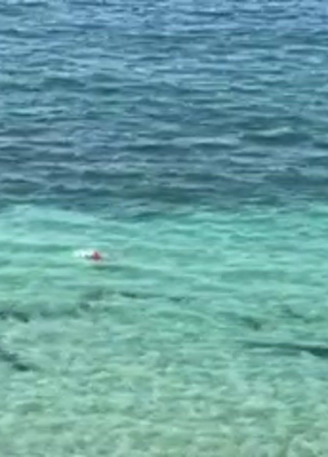 person snorkeling in clear, turquoise water. The water is shallow enough to see the bottom, which appears to be mostly sand and some dark patches, possibly seaweed or rocks. The person is wearing a red top and snorkeling gear. The surface of the water is slightly choppy. The water further out is a darker blue color.
