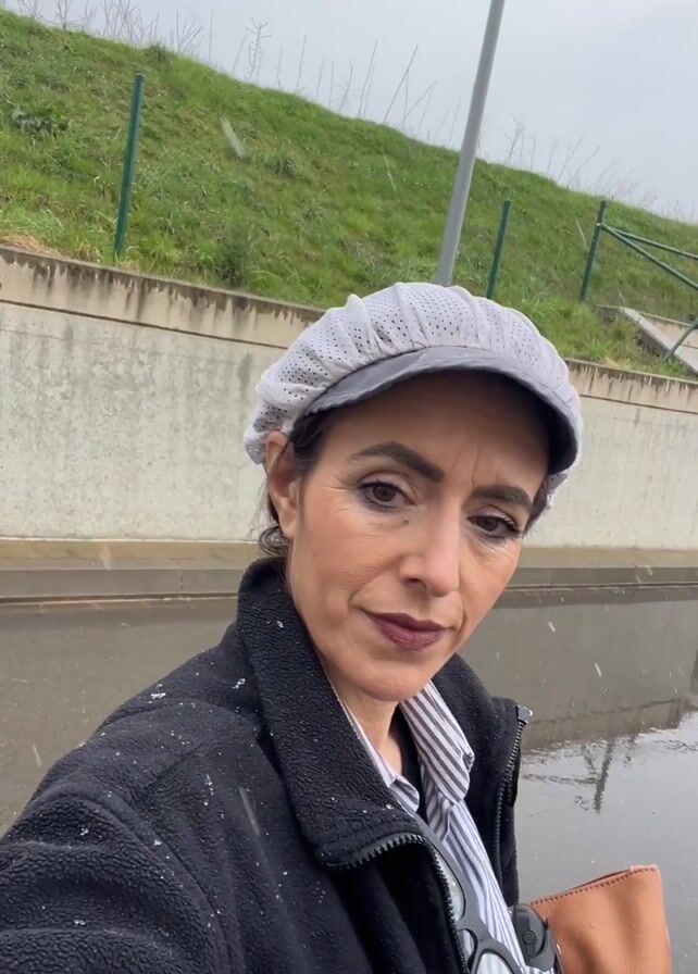 A woman is taking a selfie video on a wet, snowy day. She is wearing a gray cap, a striped shirt, and a black jacket. She has a brown purse slung over her shoulder. The background includes a concrete wall, a grassy hill, a lamppost, and a building. The ground is wet with puddles, and snow is falling. She looks directly at the camera with a neutral expression. The camera moves slightly as she is walking.