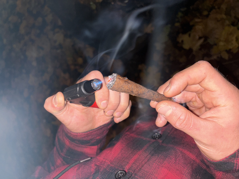 A close-up, low-light image depicts a person's hands. The individual wears a red and black plaid shirt with visible black buttons. The right hand holds a black and red butane torch lighter, producing a focused blue flame directed at the tip of a large, dark brown, textured, cigar-like object. The left hand grasps this object, the tip of which is actively glowing red with embers and emitting white smoke. The background is dark and out of focus, showing blurred brown and dark shapes consistent with fallen leaves or earth. The specific location within the city of Łódź, Poland, is not discernible from the provided visual information.