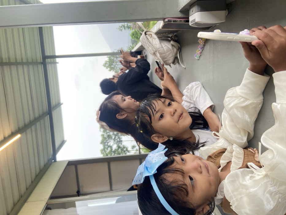Two young girls in fancy attire are prominently displayed, with one wearing a light blue bow in her hair. Behind them, an older girl and two adults are visible, all seemingly using mobile phones to capture a view of the outside. A white quilted purse and other phones rest on a ledge. The setting is partially covered by a metal awning.