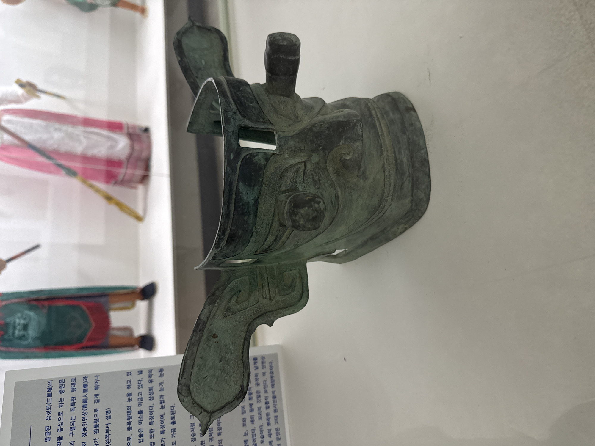 This image depicts a weathered bronze mask-like artifact on display within a museum setting in Andong-si, South Korea. The primary subject is an ancient metal object, exhibiting a dark green-brown verdigris patina, positioned prominently in the foreground on a white display surface. It features an elongated, stylized snout, large, ornate ear-like projections extending laterally, and an open top with cutouts. Intricate patterns and relief details are visible across its surface. In the blurred background, behind a transparent barrier, several static, traditional-style figures, appearing to be mannequins or large puppets, are visible. One figure on the left wears a green and red tunic, while another in the center wears a white top and a pink, striped skirt-like garment, holding a long, slender pole. To the immediate left of the bronze artifact, a white informational panel with Korean text is partially visible, containing references to "三星堆" (Samseongdae/Sanxingdui) and "청동인면상" (bronze human face statue), indicating the cultural and historical context of the exhibit. The environment is consistent with an indoor museum display. No active individuals are present in the scene.