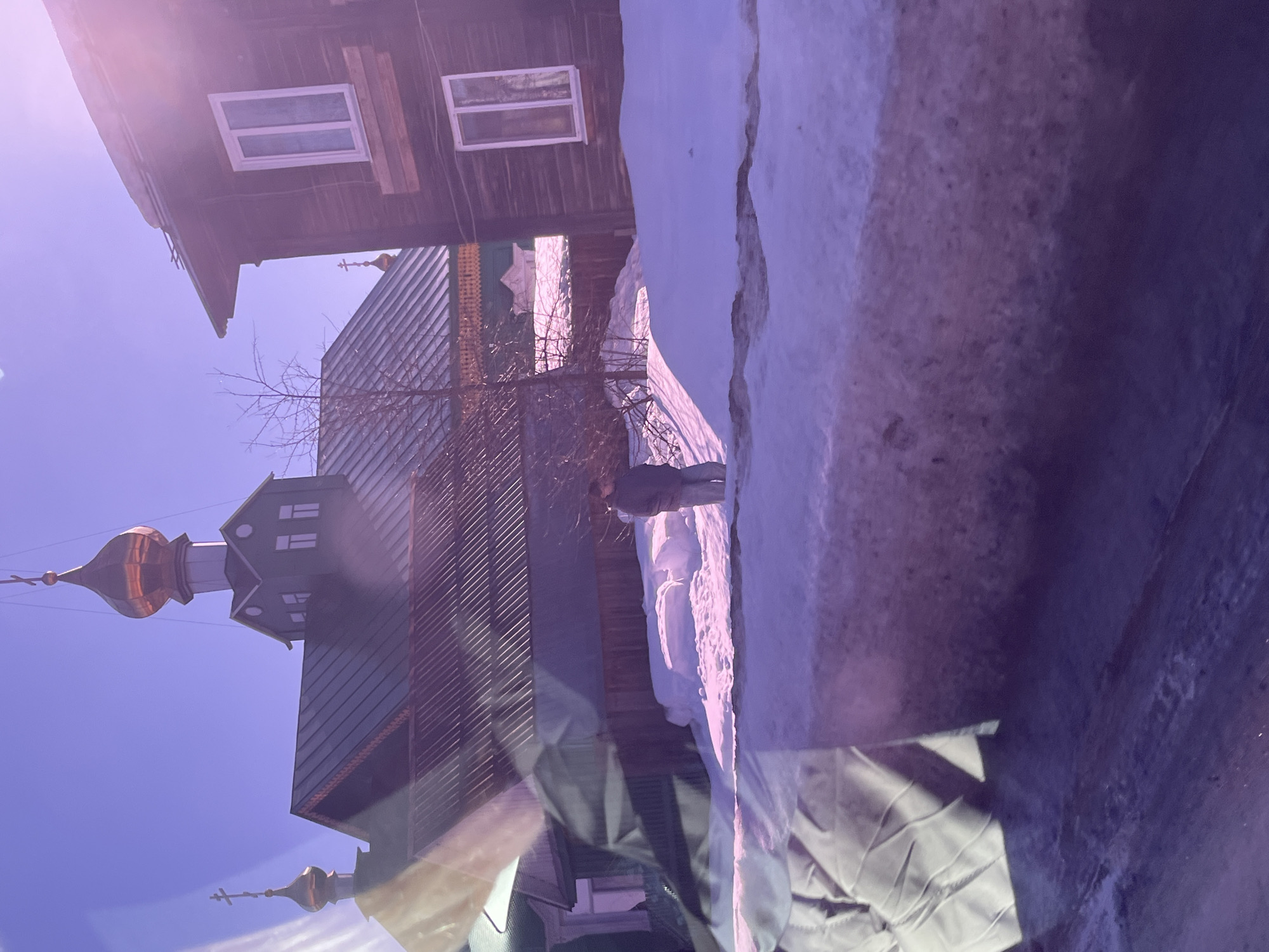 The image presents a winter street scene in Kambarka, Russia, under a bright, clear sky with prominent lens flare. A Russian Orthodox church with a dark green metal roof and two golden onion domes, each topped with a cross, dominates the background. To its immediate right stands a dark brown, two-story wooden house featuring white-framed windows. Another structure with a green roof is partially visible to the left. The ground is heavily covered with substantial snowdrifts, indicating a cold, snowy environment. A single individual, clad in a dark jacket and light-colored pants, is observed standing in the snow between the buildings, near a fence and bare tree branches. Reflections in the foreground suggest the photograph was taken from inside a vehicle.