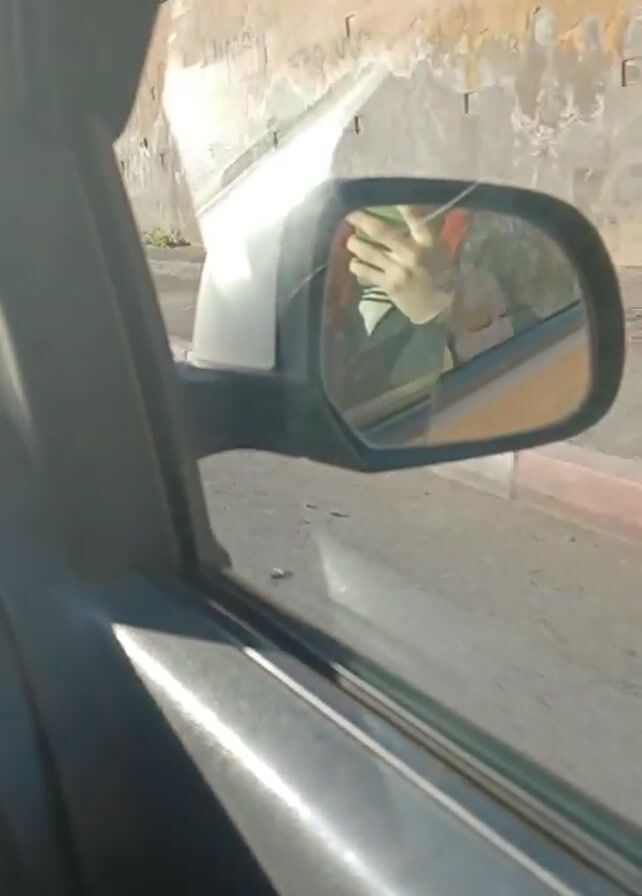 car driving along a street. The first shot is of the car's side mirror, in which a hand holding a phone is visible. The car then drives by a wall with graffiti. The next shot is from inside the car, showing the dashboard and the road ahead. The road is paved and lined with trees and buildings. The sky is clear and the sun is shining. There are a few people walking on the sidewalk.