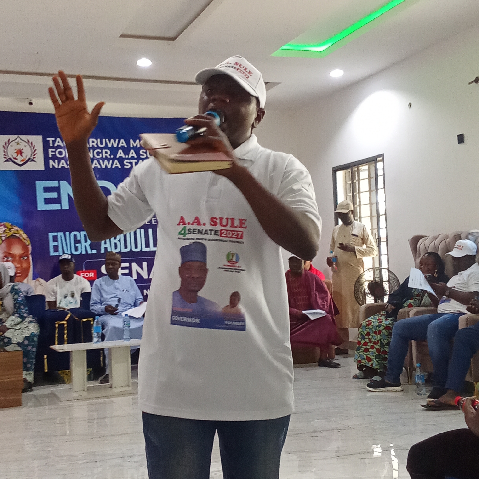 The scene depicts an indoor gathering in Akwanga, Nigeria. A dark-skinned male stands centrally, wearing a white polo shirt, blue jeans, and a white baseball cap. The shirt displays "A.A. SULE 4SENATE 2027" and images identifying a "GOVERNOR" and a "FOUNDER." He holds a blue microphone in his right hand and a brown book in his left, with his left arm raised and palm open, indicative of speaking. Behind the speaker, a large blue banner is visible, bearing a logo and white text including "TARUWA M," "NGR. A.A SU," "NASARAWA STA," "ENGR. ABDULL," and "SEN." To the left, a woman in a colorful headwrap and patterned dress, a man in a light blue traditional garment, and another man in a white t-shirt and dark cap are seated. A small white table with two water bottles is positioned near them. To the right of the speaker, a man in a cream-colored traditional outfit and cap stands near a door with a metal security grid, holding a water bottle and a mobile phone. Several individuals are seated on brown upholstered chairs, including a woman in a colorful dress and a man in a white cap and blue jeans. A black stand fan is located on the floor. The room features white walls, a white ceiling with recessed lights, and a linear green LED light strip. The floor is light-colored and polished.
