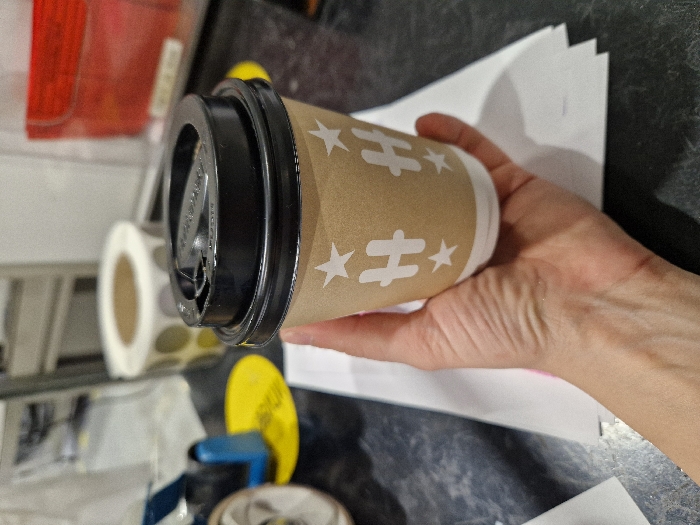 The image displays a close-up, high-angle view of a light-skinned human hand holding a disposable coffee cup within an indoor setting in Bahovitsa, Bulgaria. The coffee cup is kraft-colored paper, featuring repeating white stylized "H" letters and small five-pointed stars. It is sealed with a black plastic lid that includes a raised drinking tab marked "PUSH." The visible hand exhibits wrinkles and veins on the wrist area. The background is blurred, showing various items on a dark, mottled surface. These background objects include a roll of circular light-colored stickers, a blue and silver mechanical object, a yellow circular disc, and a red plastic container. A stack of white papers is visible beneath the held coffee cup.