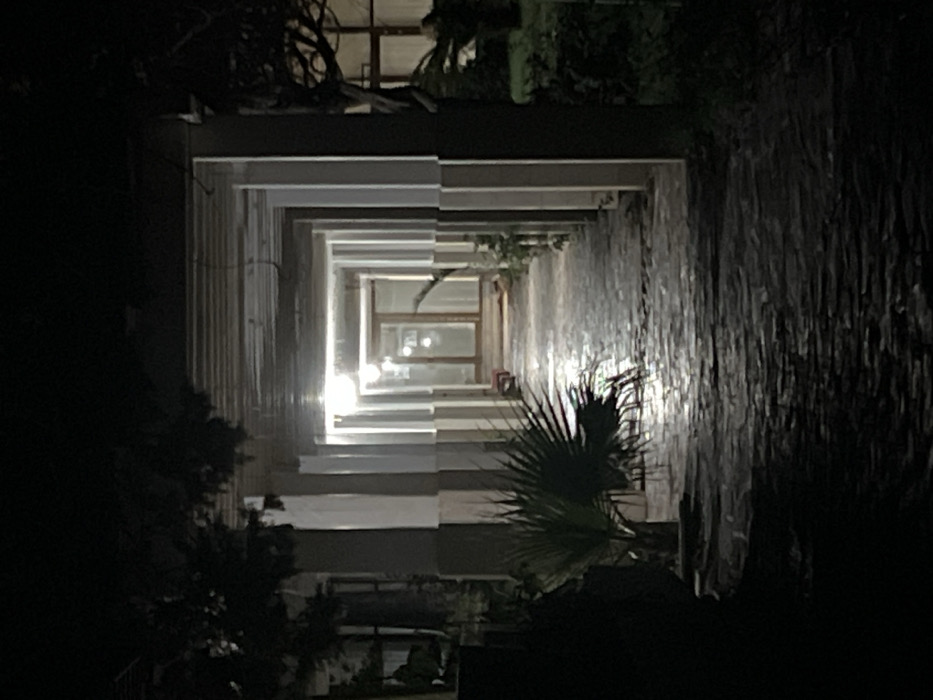 A dark, vertical shot looking up through a building's central opening. Light reflects from the window at the top and shines on the layers of concrete and windows. Plants grow on the side of the building, with a palm on the right. The scene is at night, with deep shadows obscuring much of the surrounding area.
