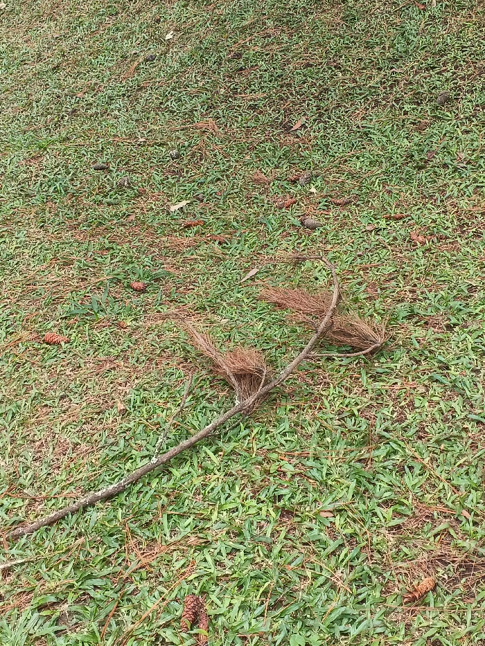 A grassy expanse covered in sparse pine needles and scattered pine cones. A fallen tree branch with clumps of dry pine needles attached lies diagonally across the center. The grass is green with hints of brown, creating a textured surface. The pine cones vary in size and are distributed unevenly across the landscape. The branch appears weathered, with light-colored patches on its bark.