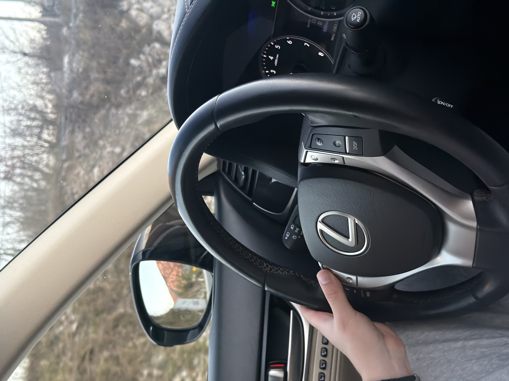 interior of a car, specifically focusing on the steering wheel which features a Lexus logo