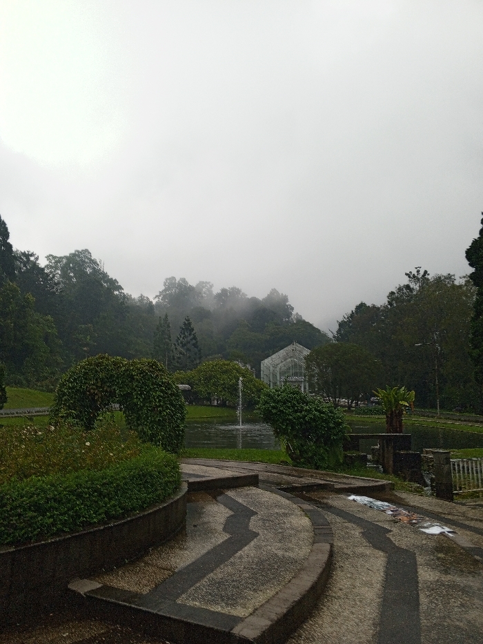 A tranquil park scene on a foggy day. A winding path leads towards a serene pond with a central fountain, surrounded by lush greenery. In the background, a white greenhouse peeks through the trees, partially obscured by the mist. The landscape includes a mix of trees and cultivated gardens. The weather creates a soft, muted atmosphere, enhancing the peacefulness of the location.