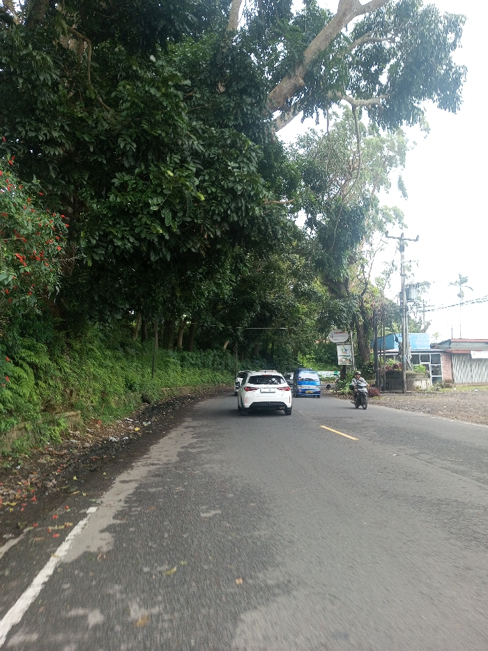 The image captures a roadside scene in Ariyalai, Sri Lanka, under an overcast sky. The primary feature is a two-lane asphalt road that curves slightly to the viewer's left. The left side of the road is bordered by a steep, vegetated embankment densely covered in green foliage, ferns, and bushes with red flowers or berries, beneath large, mature trees. A broken white line marks the left edge of the road, while a short, broken yellow line is visible in the right lane. Three vehicles are present: a white, modern SUV (resembling a Mazda CX-5) is positioned in the right lane, moving away from the viewer. Behind it, a blue van or mini-truck also travels away from the viewer. On the right side of the road, a single individual wearing a light-colored helmet and jacket operates a dark motorcycle, appearing to be moving towards the viewer or turning. The right side of the road features an unpaved dirt shoulder, multiple utility poles with overhead power lines and a transformer, a partially visible business sign, and several low-rise buildings, including a light blue structure and another with a grey or patterned facade. Large trees with dense canopies overhang portions of the road on both sides.