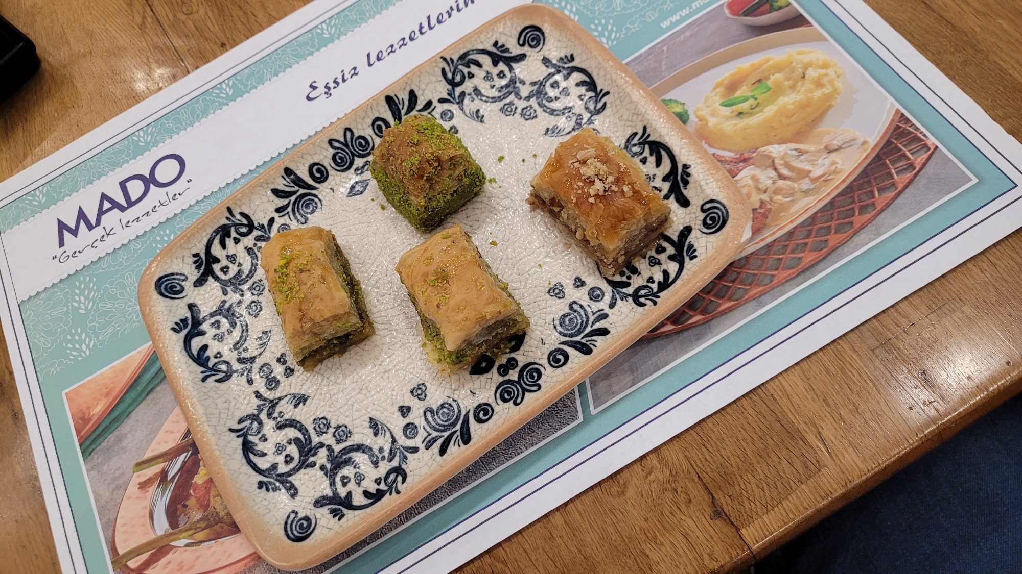 plate of four pieces of baklava, a traditional Turkish dessert, placed on a MADO restaurant placemat