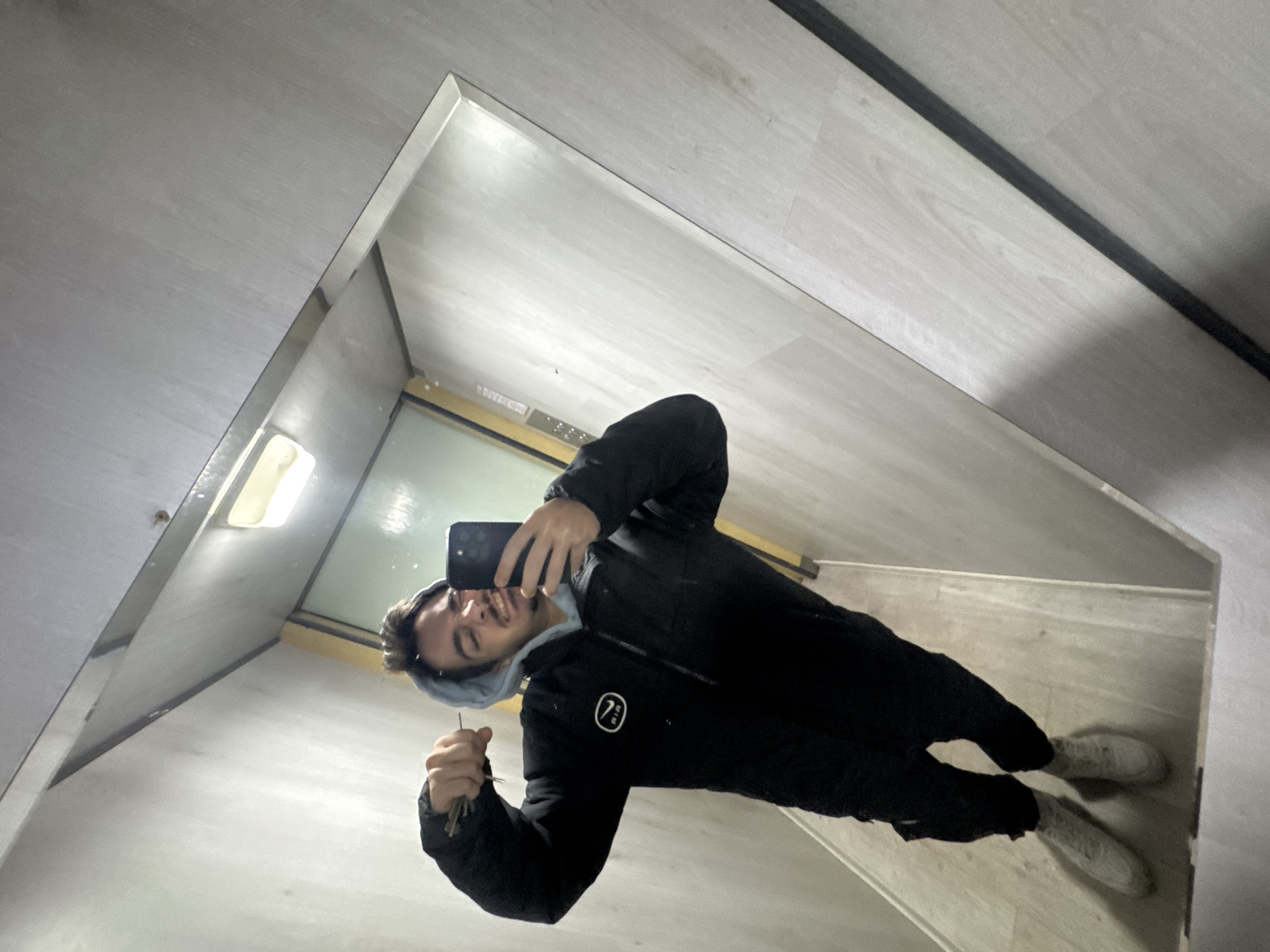 A young man is taking a selfie in a mirror. He is wearing a black jacket with a blue hood, black pants, and light-colored sneakers. He is holding a set of keys in his left hand and a smartphone in his right. The mirror is reflecting a hallway with light-colored walls and floors. A rectangular light fixture is visible in the reflection. The location of the scene is not discernible from the image.