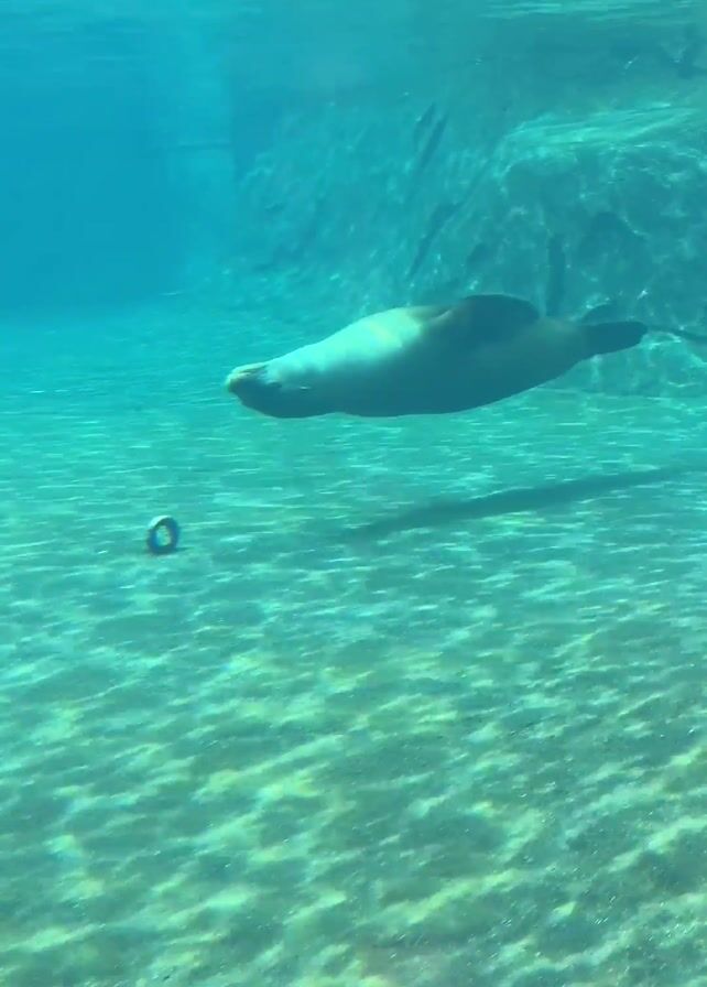 seal swimming underwater. The water is clear and blue, and the sandy bottom is visible. The seal swims smoothly, its body long and sleek. The seal passes a ring or doughnut shaped object on the ocean floor. The camera follows the seal as it swims past.