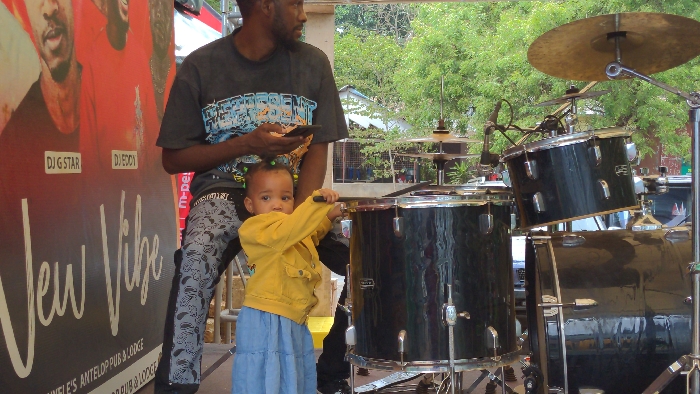 A young child in a yellow jacket and denim skirt stands in front of a black drum set, gripping a drum stick. A man wearing a black t-shirt and patterned pants stands behind the child, looking at his phone. To the left, a promotional poster with the words "New Vibe" and the names "DJ G-Star" and "DJ Eddy" is visible. The background features trees and a glimpse of a building.