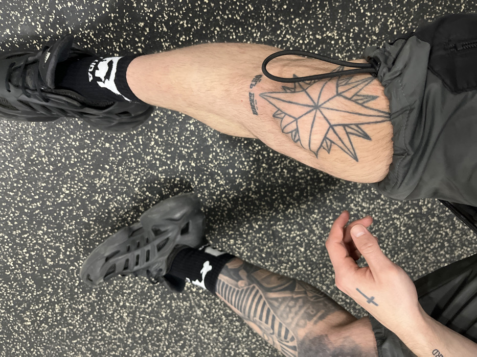 The image depicts the lower body of a single individual, likely seated or reclining, with their legs extended on a dark, speckled rubberized floor, typical of an indoor gym or fitness facility. The precise location within Sapareva Banya, Bulgaria, cannot be determined from the visual evidence. The individual's left leg displays a dark, intricate tattoo sleeve covering the calf and shin. They wear a black, heavily structured and porous sneaker and a black low-cut sock with a white logo or text. The right leg, partially covered by dark grey or black athletic pants, shows a large outline tattoo of a multi-pointed star (compass rose style) above the ankle, with a smaller horizontal text tattoo in an unfamiliar script above it. This leg also features a black low-cut sock with white text and a black, traditional lace-up athletic sneaker. A black elastic cord is visible on the cuff of the right pant leg. The individual's left hand, resting near the left thigh, has a small cross-sword tattoo on the back and faint text tattooed on the wrist.