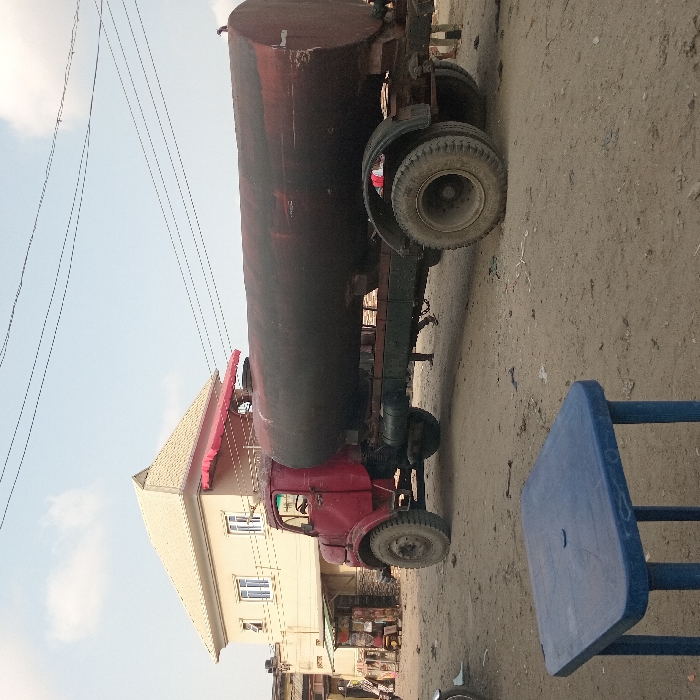 The scene, located in the city of Alaiyabiagba, Nigeria, depicts an unpaved outdoor area under a light blue sky with sparse clouds and multiple overhead utility lines. In the immediate foreground, a blue plastic square table with four legs is positioned. The ground is light brown dirt or sand, showing minor debris. The central subject is a large, stationary, heavily weathered tanker truck facing left. The truck's cab is faded red, exhibiting significant paint loss and rust. The attached cylindrical tank is dark reddish-brown, appearing heavily rusted and worn. The truck features multiple robust wheels. The lower legs of an individual are faintly visible beneath the truck's chassis near the rear wheels. In the background, a two-story building with a cream-colored facade and a light-colored hip roof stands. It has several rectangular windows with white frames, and a red retractable awning is extended on the upper floor. To the left of this building, a smaller, single-story structure with a dark green corrugated metal roof appears to be a commercial stall. The area suggests a typical street or open space within an urban environment.